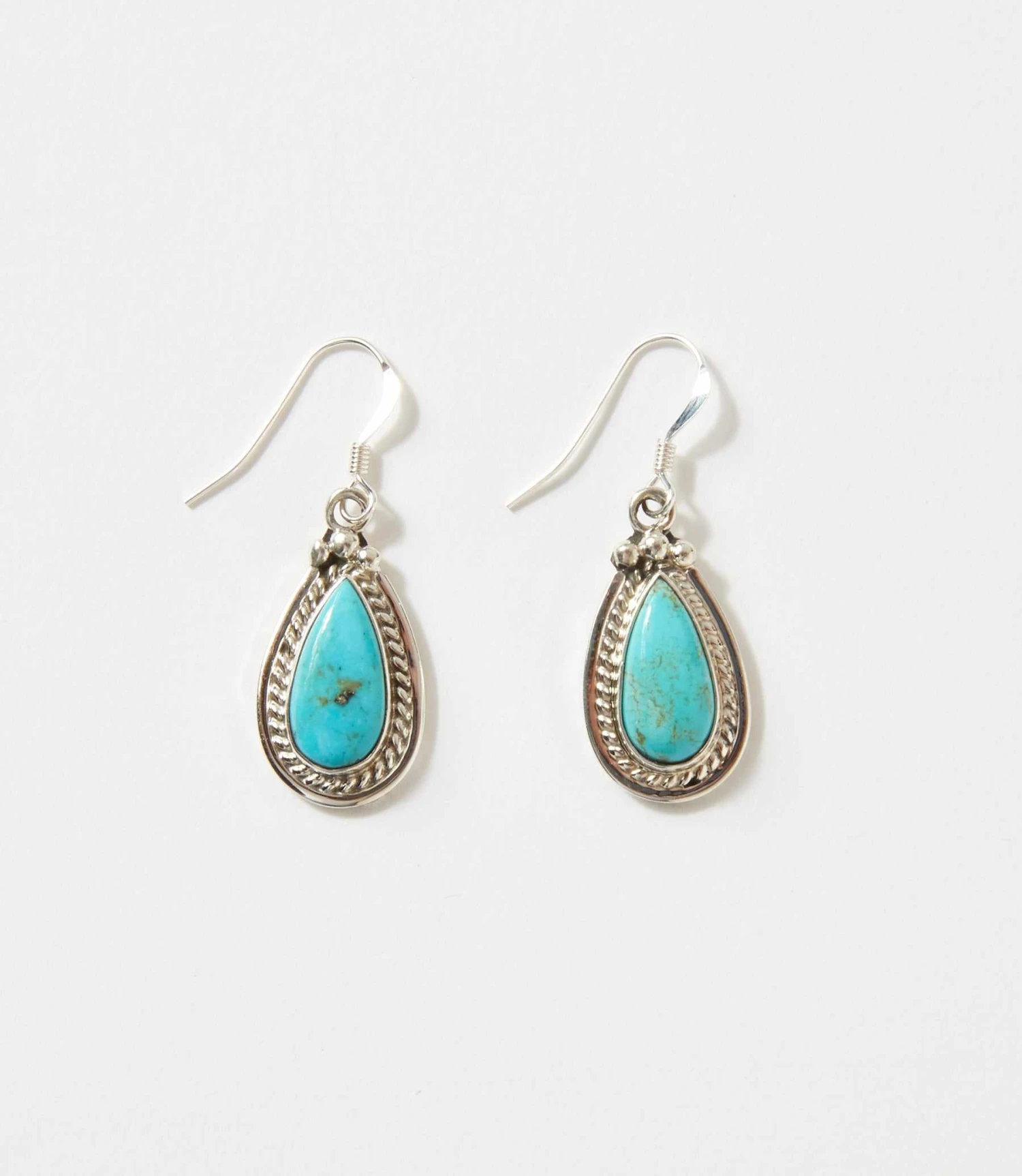 These Kingman Turquoise Teardrop Earrings feature pear-shaped turquoise stones set in detailed sterling silver bezels with twisted rope accents. The natural variations in the turquoise add character and depth to each piece. Finished with sterling silver French hooks, they offer secure, comfortable wear and subtle movement that catches the light beautifully.
