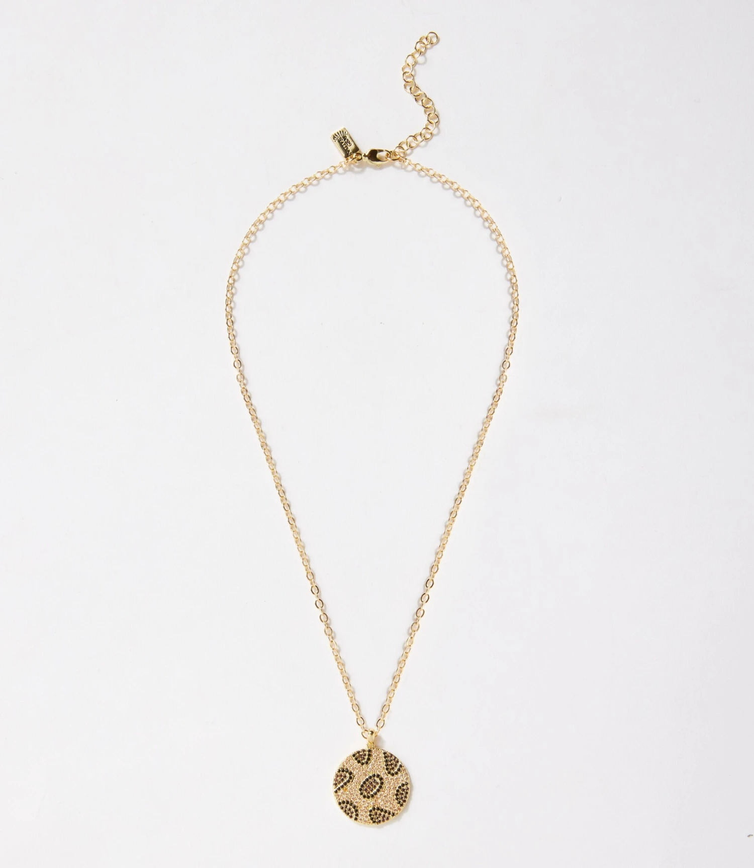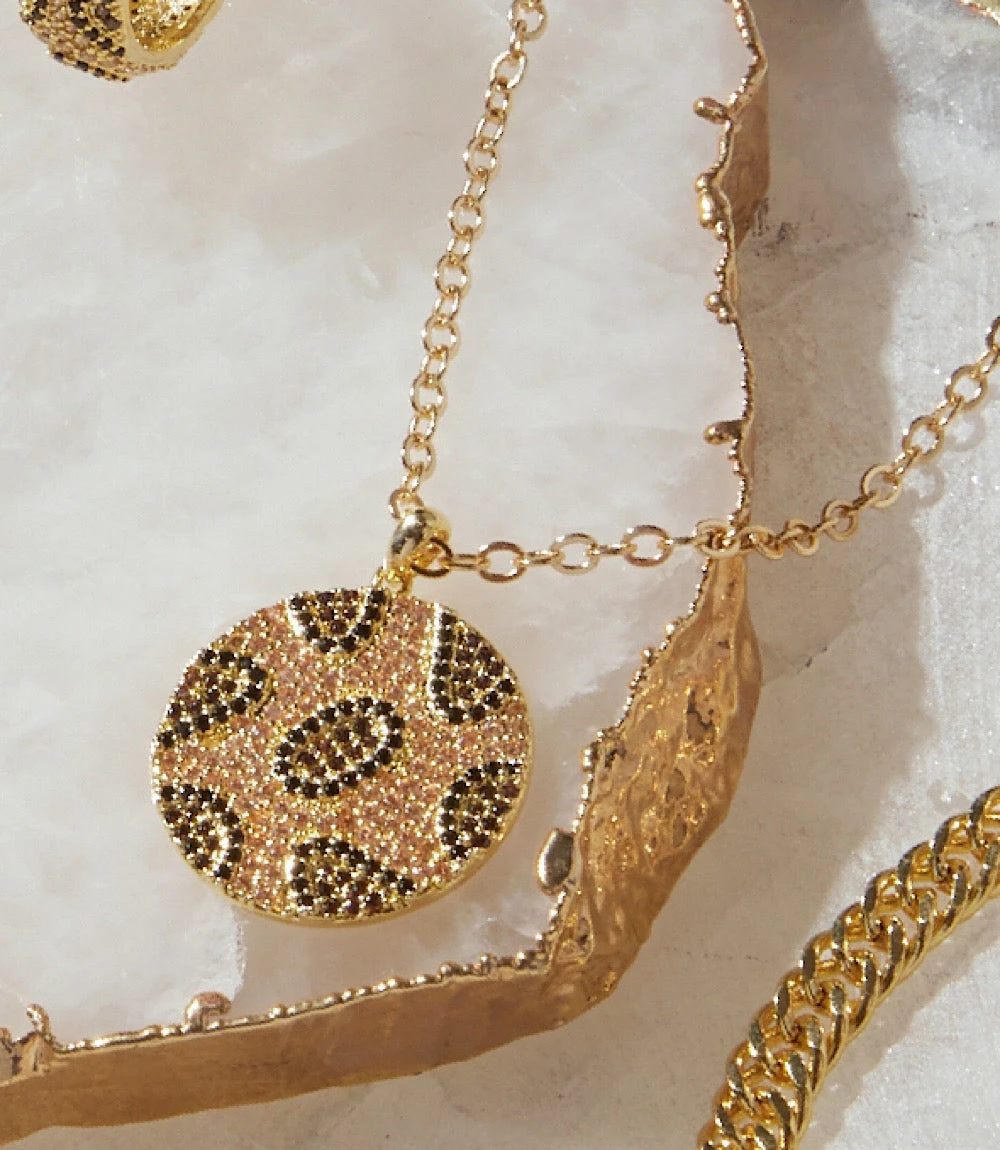 Featuring a round pendant encrusted with shimmering cubic zirconia in a bold leopard pattern, this necklace brings glam and edge together effortlessly. Crafted from brass with a 14K gold plate, it delivers a luxe finish perfect for layering or wearing solo. Pair with matching Earrings and Ring