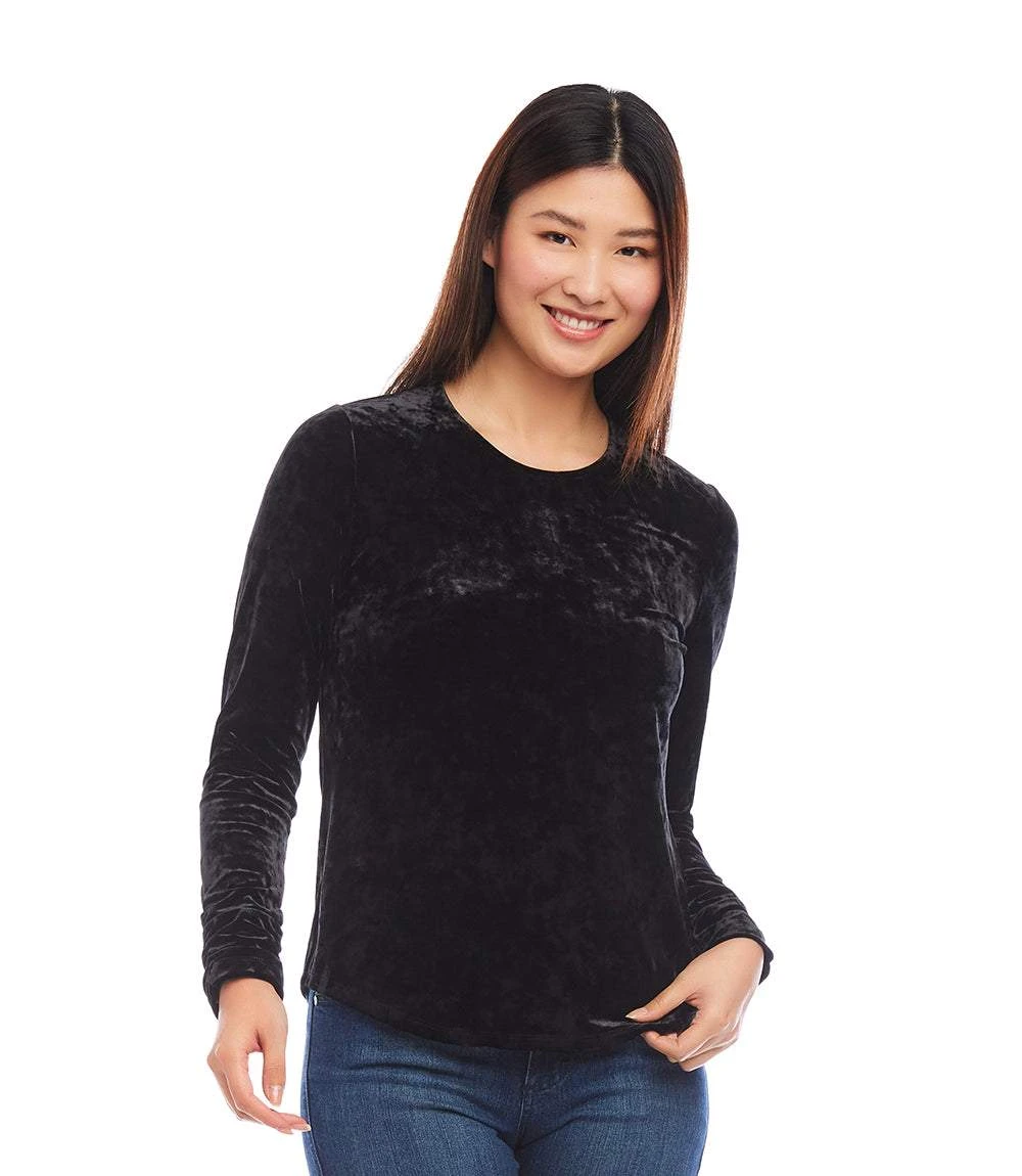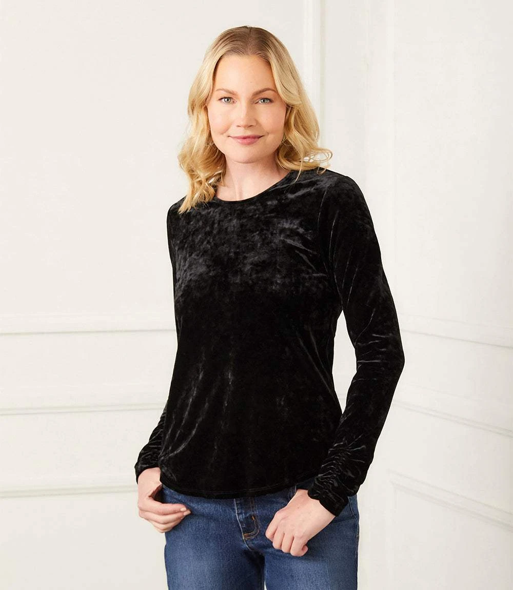 Expertly crafted from luxurious stretch velvet material, this top offers both comfort and style. With shirred cuffed sleeves and a fitted silhouette, this piece effortlessly combines elegance and versatility. Perfect for any occasion, this top is a must-have for any fashion-forward wardrobe.
