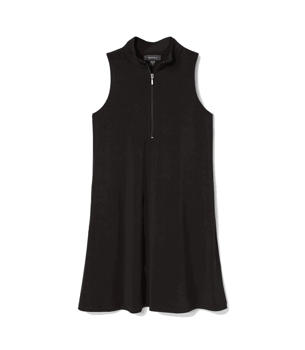 Made from soft, wrinkle-resistant travel jersey, it features a half-zip front with a collar that can be worn up or folded down for a more relaxed look. Side pockets add function, while the above-the-knee length keeps the silhouette casual and breezy—perfect for everything from sightseeing to weekend strolls.