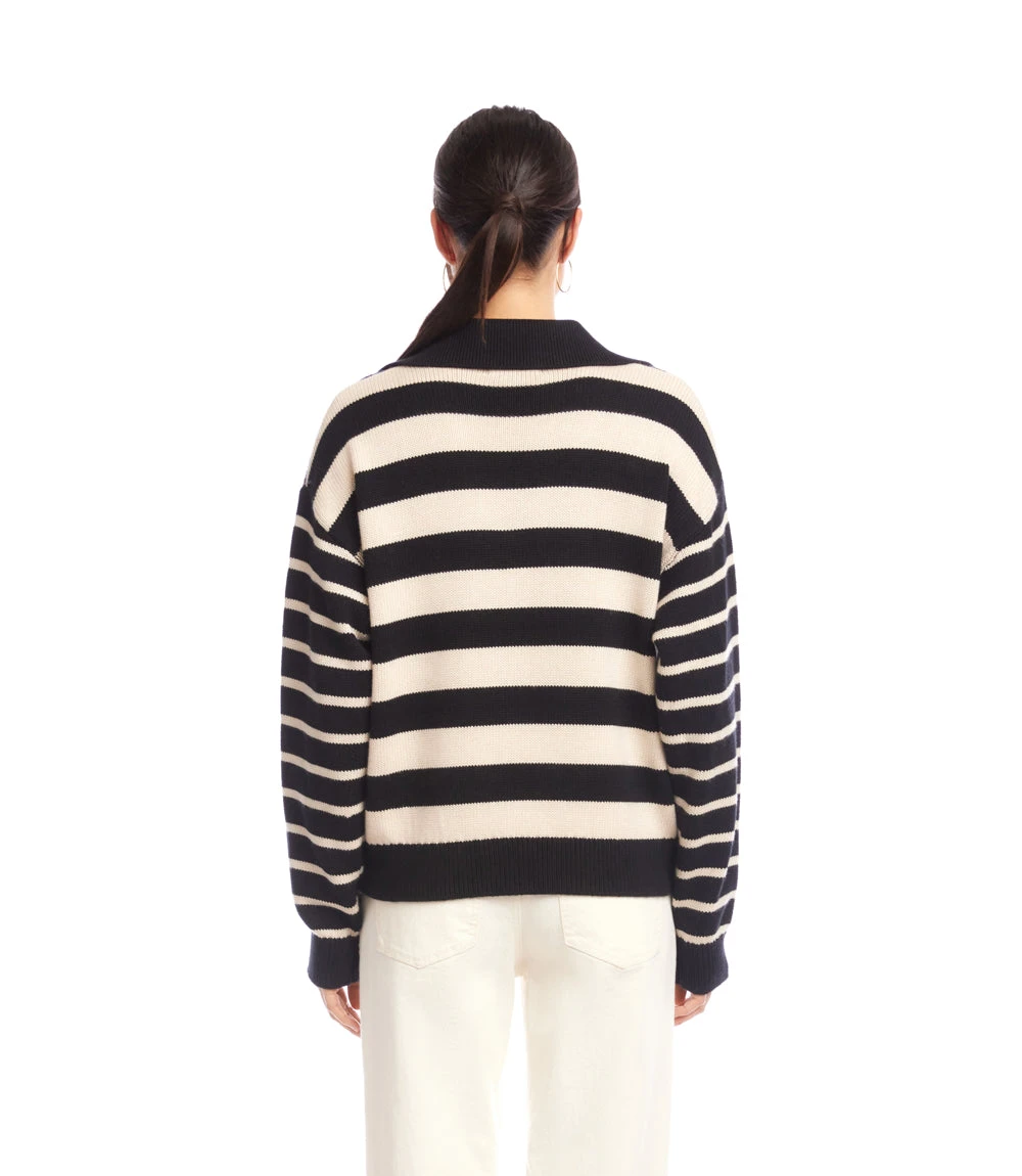 Designed with a softly scooped neckline, collared placket, and relaxed dropped shoulders, it’s finished with wide ribbed edge bands at the hem and cuffs for a structured touch. The extended sleeves and slightly shortened hem enhance the relaxed fit, lending an effortless, cozy vibe. The allover stripe pattern adds a graphic element that feels both timeless and fresh.