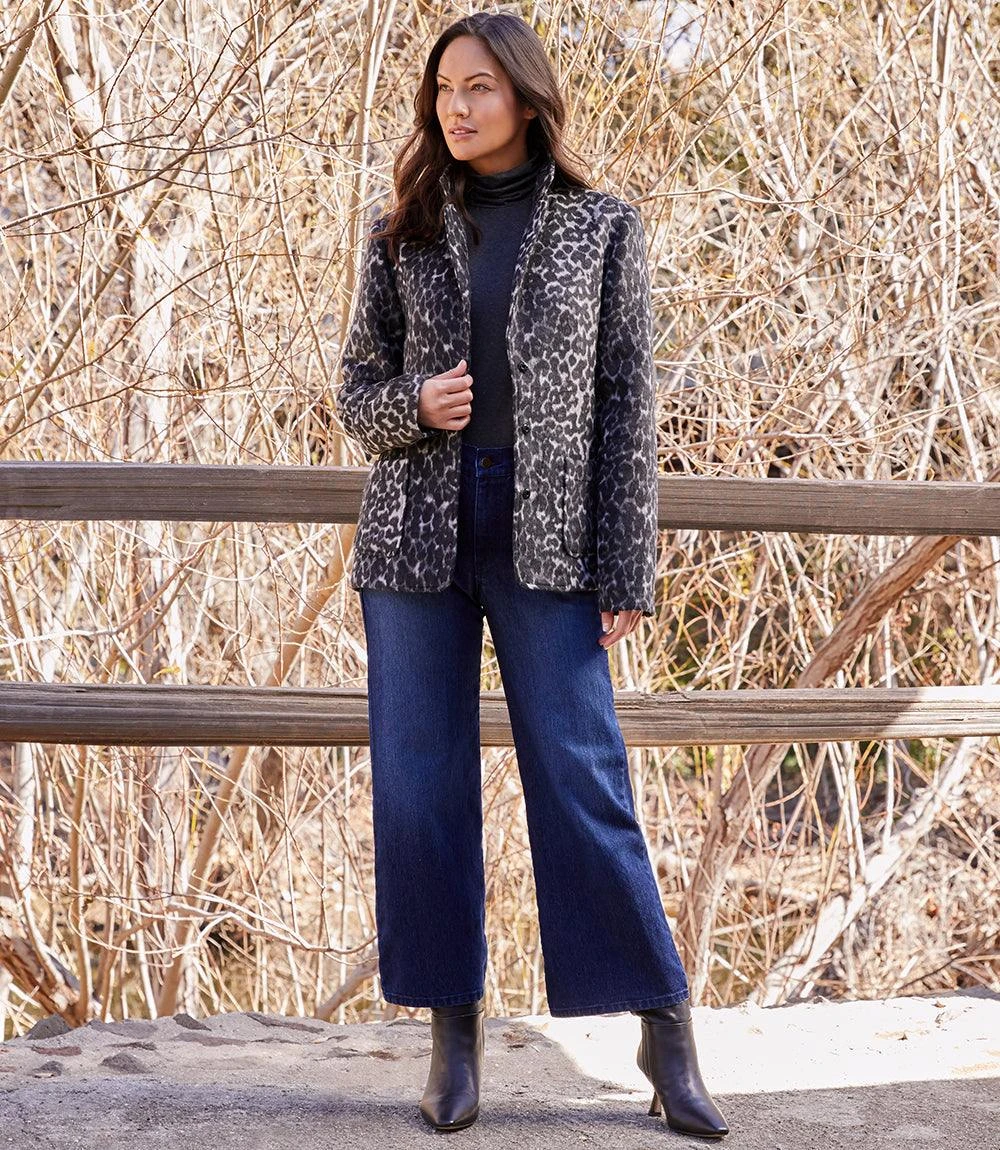 A dark denim wash creates these shapely stretch jeans detailed with a slimming mid-rise and stylish wide-leg cropped silhouette.